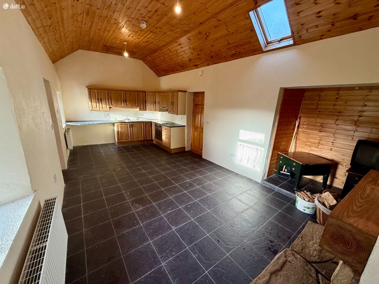 - Open plan kitchen, dining and living area with open solid fuel fireplace.