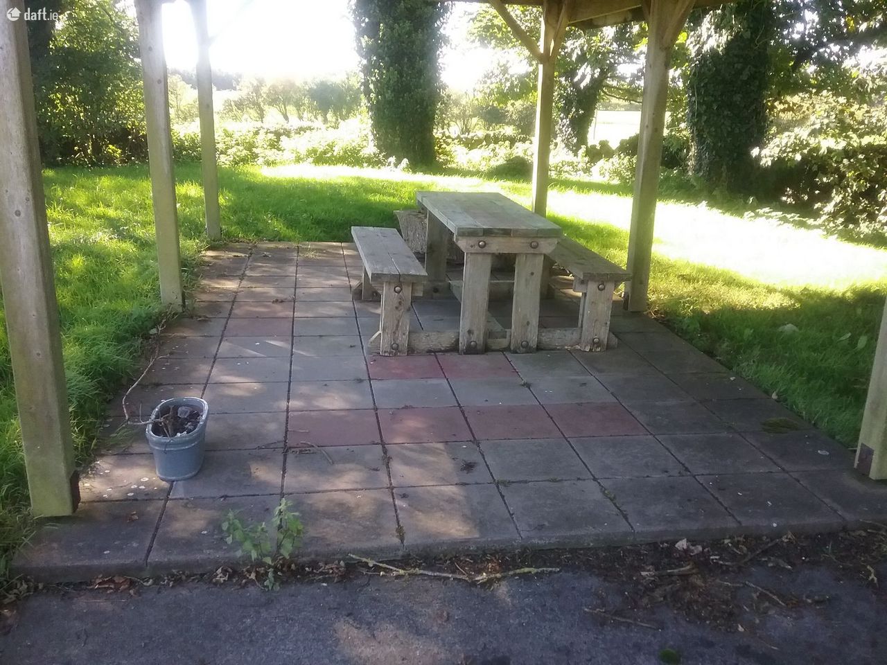 There are extensive gardens with an attractive metal seat wrapping around one of the mature trees and a patio area with a wooden table and benches to enjoy outdoor sunshine.